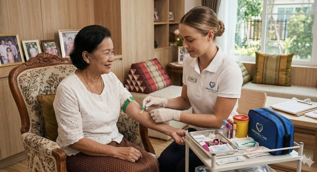 บริการพยาบาลเยี่ยมบ้าน (Home Nurse): ให้การพยาบาลวิชาชีพ เช่น ทำแผล, เปลี่ยนสายอาหาร, เจาะเลือด